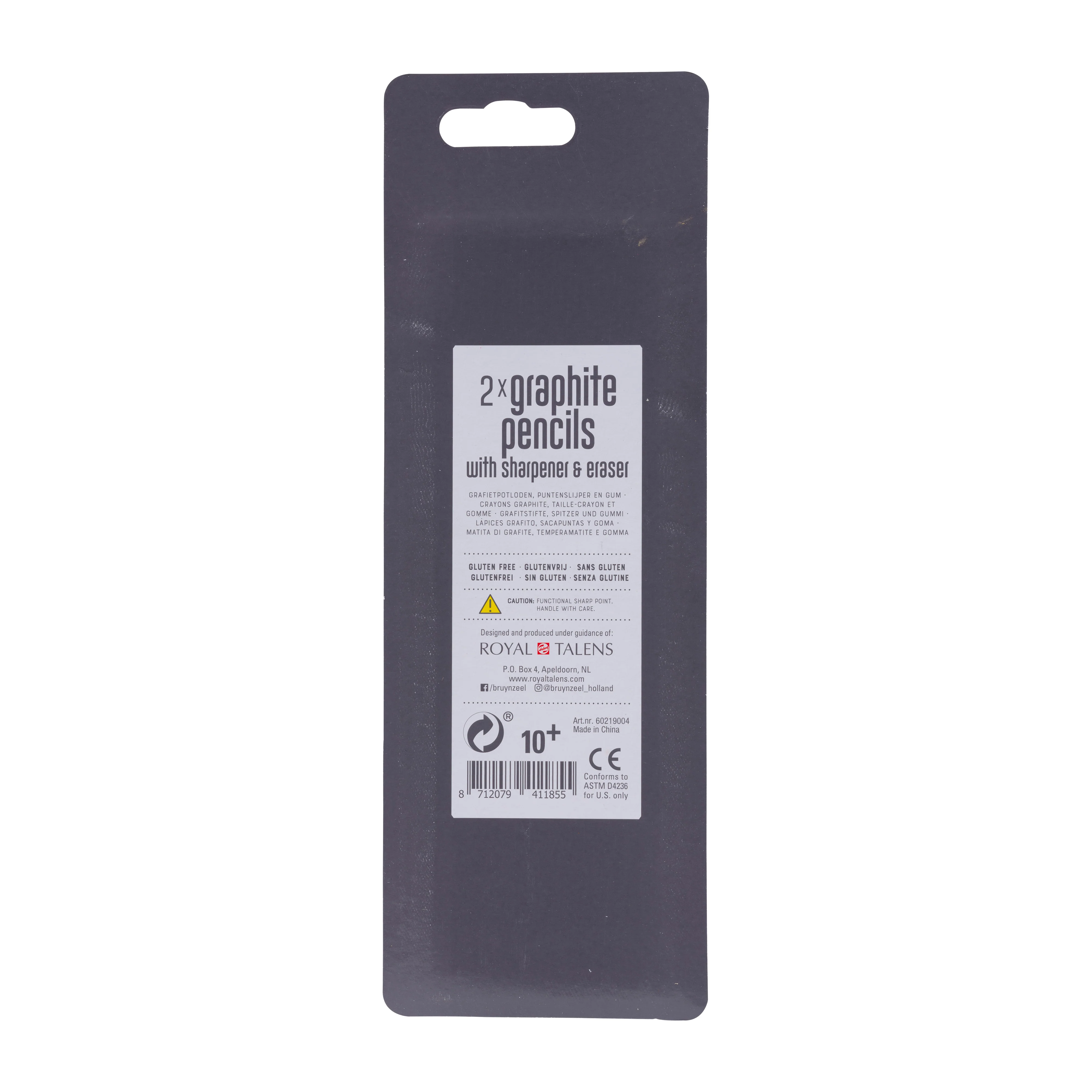 Blister with 2 HB graphite pencils, sharpener and eraser.